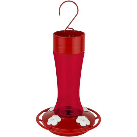 Experience the joy of feeding the hummingbirds in your backyard with this Antique Hummingbird Gravity Feeder! This feeder's unique antique feel, hummingbird-friendly features, and easy maintenance design are sure to make it your new favorite hummingbird feeder. Maximize hummingbird comfort and viewing with five flexible lifelike flower ports and a built-in continuous perch ring for more perching space. Defend your nectar and protect your hummingbirds with the domed feeder base and flower ports which create a naturally bee-resistant design. Never worry about trapped dirt or grime since the two-part base system and removable flower ports allow the feeder to be completely disassembled for a thorough cleaning. The large red glass reservoir holds up to 25 oz of nectar.