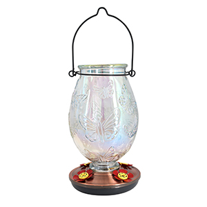 Attract more hummingbirds to your yard with this antique textured glass hummingbird feeder! The feeder base includes a built-in continuous perching ring to allow the hummingbirds to perch while feeding, which can increase feeding time and leads to even more hummingbird viewing. Flexible feeding ports optimize feeding comfort while also acting as Leak Free gaskets. The domed shape of the feeder base and the flower port position creates a naturally bee-resistant design. All feeder parts are removable, making it that much easier to keep the feeder clean and your hummingbirds healthy.