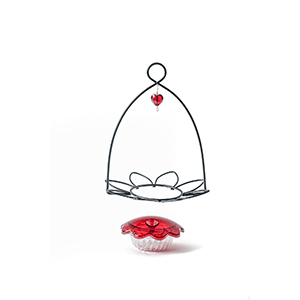 3 oz nectar capacity. One nectar port Red ornamental heart jewel hangs from the center Small feeder can hang anywhere. Easy to fill and clean. Measures 8" L x 8" W x 10" H