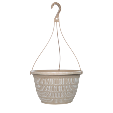 6" Capello resin hanging basket with saucer and hanger. Perfect for dropping in succulents or houseplants. Hanging basket opening diameter 6.69" x 4.53" high. Comes with 18" braided hanger and snap on saucer. Holds .48gal soil volume.