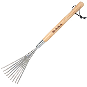 Fixed tine shrub and leaf rake with 25 extra-wide tines; applies