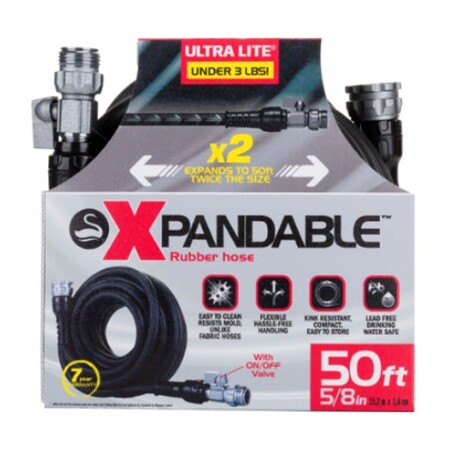 Ultra lightweight, expandable rubber garden hose for watering delicate flowers, small garden beds and washing cars. Effortlessly expands 50', twice its size, when water is on! Rapidly retracts for easy transport and storage. Weighs less than 3 lbs. Durable multilayer construction, leak proof design.