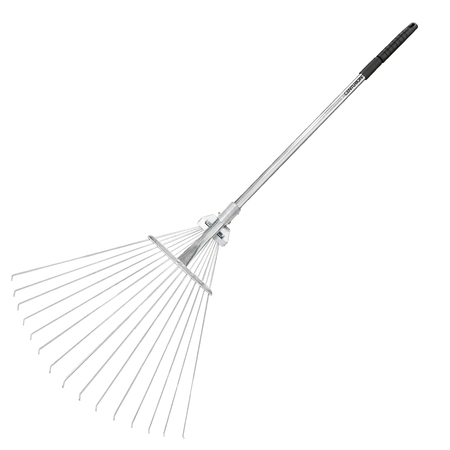 Aluminum alloy rake handle telescopes from 31" to 63" for all your raking needs. Rake tough steel tines adjust from 7" to 22" wide.
