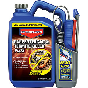 Kills ants, termites, fleas, ticks, crickets, spiders, flies, and more. Even controls carpenter bees. Pump style sprayer with adjustable nozzle. Use on lawns, landscapes foundations, decks, and around home structures. Please note that state registrations and availability are subject to change. BioAdvanced Carpenter Ant and Termite Killer Plus- it's do it yourself, done right! Termites, carpenter bees and other wood infesting insects can damage wooden structures in and around the home. Decks, eaves, window frames, even interior walls may be in danger. But, armed with the Blue Bottle, you can protect your property on your own. Our innovative packaging and one-step solutions keep things simple and controls wood-infesting pests. It controls over 75 listed pests on contact, including wood-infesting, stinging, crawling, and flying insects. It protects against ants, termites, fleas, ticks, crickets, spiders, carpenter bees, and more. The broad-spectrum formula can be used on lawns, landscapes, foundations, decks, and around home structures. It acts as a protective barrier around the home. The product can also be used indoors around sinks and storage areas, behind baseboards, around doors and windows and more. The ready-to-use formula is perfect for quick application. BioAdvanced Carpenter Ant and Termite Killer Plus measures 1.3 Gallons.