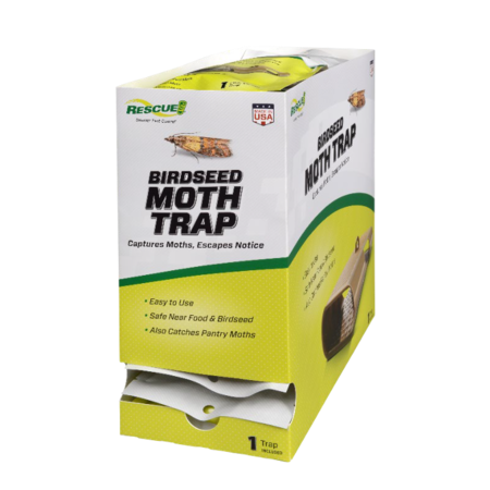The RESCUE! Birdseed Moth Trap lures and traps birdseed and pantry moths on the glue dot pattern inside the trap using our powerful pheromone. With a hard plastic shell in a neutral color, this trap is both durable and discreet in the home. Hang or place to catch common birdseed and pantry moths \u2013 including Indian meal moths, raisin moths, almond moths, Mediterranean flour moths, and more. That\u2019s Smarter Pest Control.