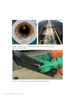 FIGURE 1 | Biofilm buildup in irrigation lines (left); algae development under propagation benches and walkways (right) FIGURE 2 | Unrooted cuttings submerged in tank (Photo Credit: BioWorks) 22 | GRIFFIN GAZETTE 2 0 25