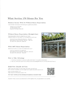 • Greenhouse structures, controllers & benching 1. Consult your tax advisor to ensure you qualify under Section 179 and Bonus Depreciation.