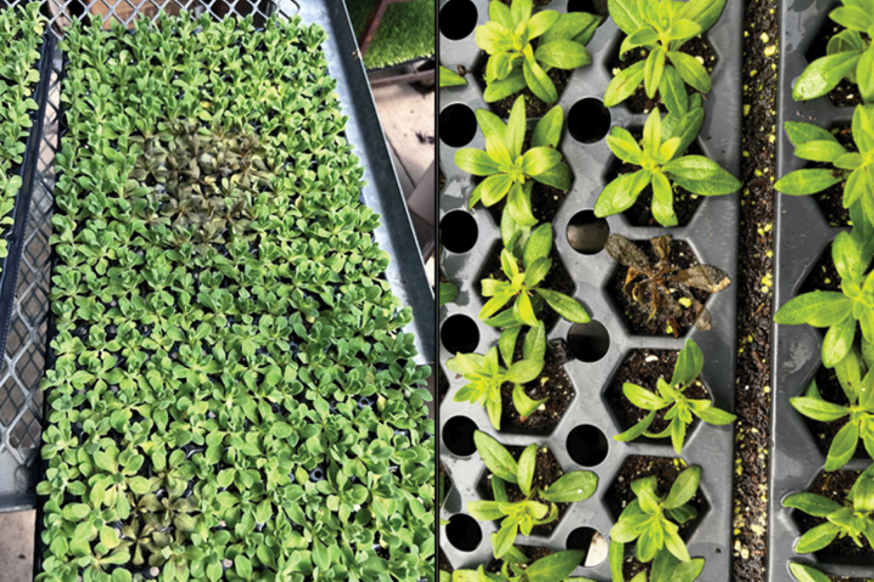 Figure 2: Rhizoctonia (left) and Botrytis (right) blight on Petunia & Calibrachoa liners.