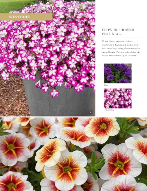 WESTHOFF FLOWER SHOWER PETUNIA (A) Flower Shower petunias perform beautifully in baskets and garden beds with mounding-trailing plants covered in bright blooms. Two new colors bring the Flower Shower series up to 10 colors. Blue B Ringo Star A B