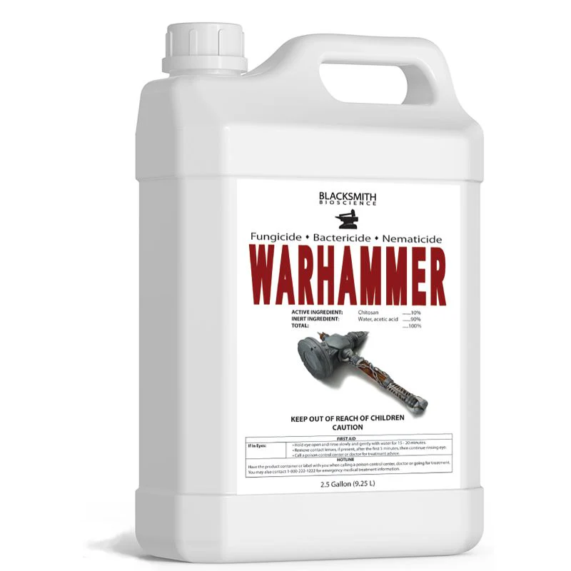 WarHammer from Blacksmith BioScience brings us an entirely new and versatile active ingredient. Chitosan is a natural substance derived from chitin, the biopolymer that forms the hard exoskeleton of crustaceans such as crabs and shrimps. WarHammer contains 10% chitosan, a natural plant defense elicitor, meaning that it triggers the plant’s immune system to fight against pathogens and stress. Diseases suppressed include Fusarium, Rhizoctonia, Pythium, Phytophthora, Sclerotinia, Verticillium, and other soil-borne pathogens. Above-ground disease suppression covers powdery mildew, downy mildew, Botrytis, Erwinia, fungal leaf spots, and interestingly, viruses as well such as tobacco mosaic virus. WarHammer is also labeled as a nematicide, adding to the short list of tools to combat common species such as root-knot and lesion nematodes. In addition, chitosan may enhance plant growth and productivity by improving the absorption of essential minerals, such as nitrogen, phosphorus, and potassium, and help plants cope with extreme temperatures, drought, and salinity by reducing water loss and increasing antioxidant activity. WarHammer is labeled for various crops, such as fruits, vegetables, grains, nuts, and herbs, and it can be applied as a soil drench, foliar spray, seed treatment, or by soil incorporation. OMRI certified, 0-hr REI, 0-day PHI.
