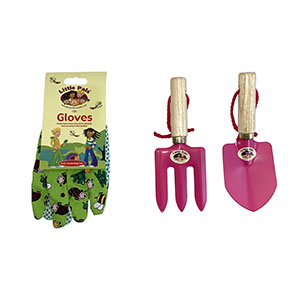 Includes green tool pouch, hand trowel, hand fork and children's garden gloves